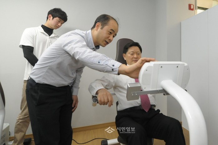 최근 서울 중구 황학동 주민센터에서 개최된 주민인사회와 함께 새롭게 문을 연 황학동 보건지소 개소식에 참석한 최창식 중구청장이 U-건강센터를 방문해 건강체크기구를 체험하고 있다.(사진제공=중구청)