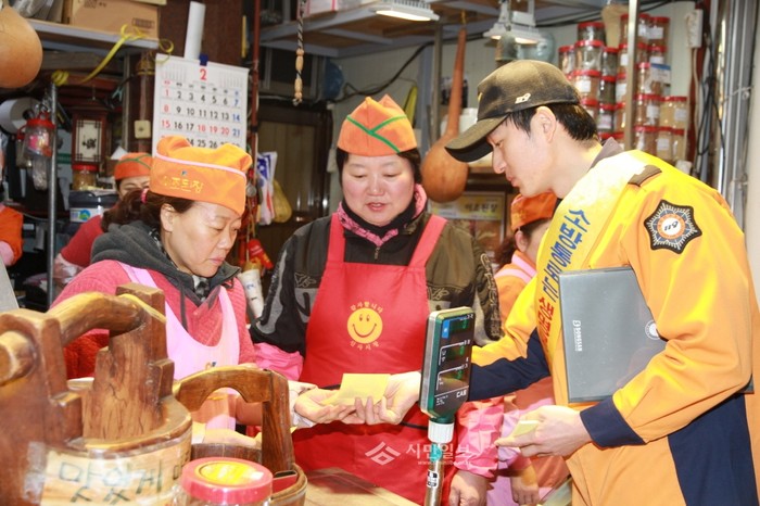 16일 오전 서울 구로소방서가 남구로시장 일대에서 구로의용소방대, 구로구청, 남구로시장 상인회와 공동으로 연휴기간 동안 시장에서 화재가 발생해 인명·재산 피해가 발생하는 것을 막기 위해 소방통로 확보 훈련과 화재예방을 위한 홍보물을 배포하는 '설 연휴 대비 소방차 길 터주기 캠페인'을 실시했다. 사진은 홍보물을 배포하는 관계자의 모습.(사진제공=구로소방서)
