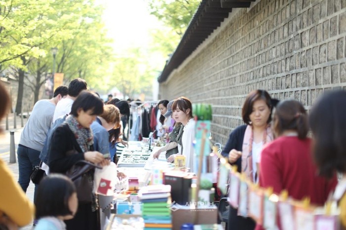 | ▲ 역사적 문화자원인 덕수궁 돌담길에서 열린 '돌예공' 행사에 참가한 관광객들이 전시된 물건들을 살펴보고 있다. (사진제공=중구청) | ||