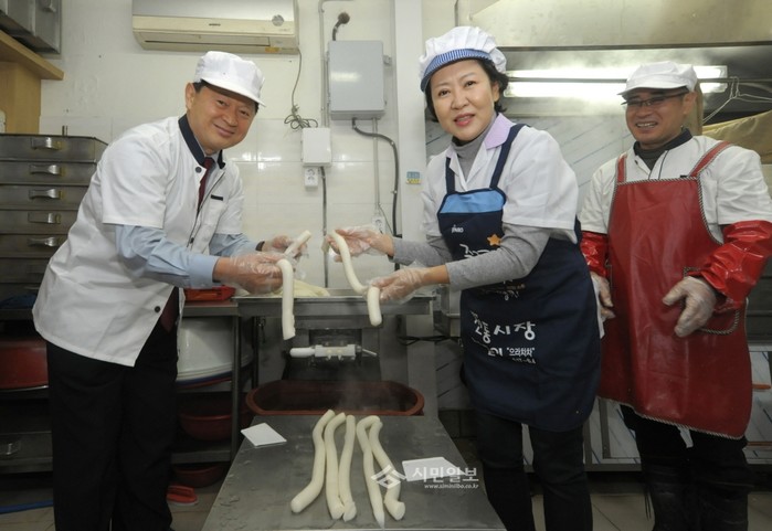 최근 설명절을 맞아 서울 중구 중부시장 떡집에서 실시한 '설맞이 가래떡뽑기 체험 행사'에 참가한 최창식 구청장이 시장 상인과 함께 가래떡을 뽑고 있다.(사진제공=중구청)