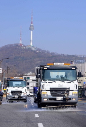 24일 오후 서울 삼각지역 일대에서 용산구청 청소행정과 관계자들이 황사로 도로에 쌓인 분진 등을 물로 청소하고 있다.