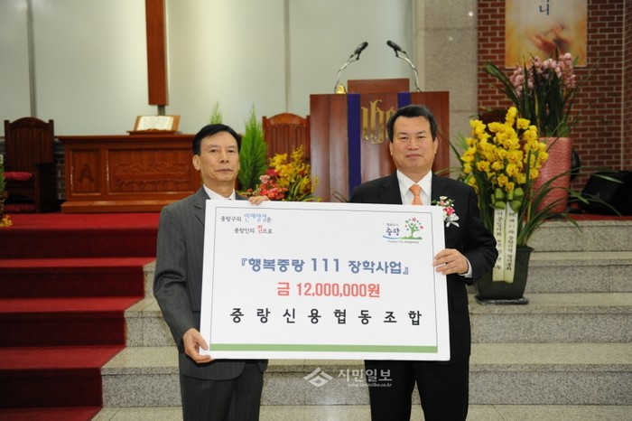 24일 서울 중랑신용협동조합이 중랑구에서 진행하는 '행복중랑 111 장학사업'에 1200만원의 장학금을 기탁했다. 중랑신협의 중랑장학기금 기탁은 지난해 500만원에 이어 두 번째다. 사진은 나진구 중랑구청장(오른쪽)과 이상군 신협이사장의 모습. (사진제공=중랑구청)