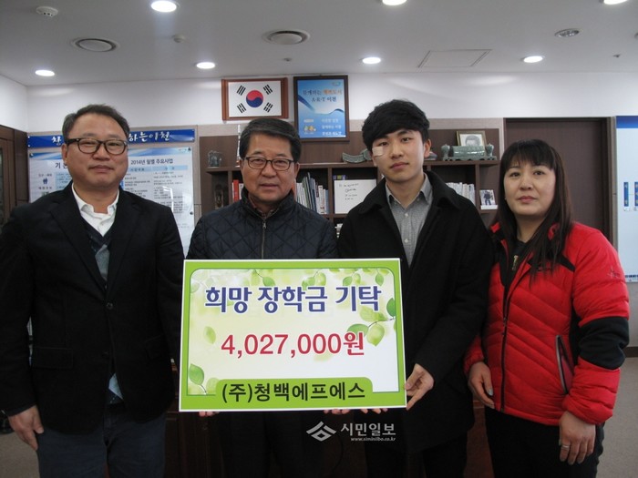 지난 23일 경기 이천시는 시장집무실에서 지역내 기업인 '청백FS'와 함께 희망장학금 전달식을 열고 어려운 환경 속에서도 학업에 열중한 김진현군에게 장학금을 전달했다. 이날 전달된 장학금은 청백FS가 전액 지원했다. (사진제공=이천시청)