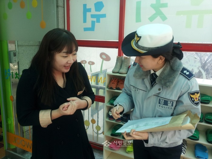 인천 중부경찰서가 25일 오전 중구에 있는 6개 유치원을 방문해 '어린이통학버스 신고 의무화' 등의 내용을 담은 도로교통법의 안정적 정착을 위한 홍보를 실시했다. 사진은 중부경찰서의 한 순경이 유치원을 방문해 지도교사에게 통학차량 안전 관련 홍보를 하고 있는 모습. (사진제공=중부경찰서)