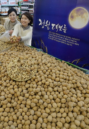 26일 정월대보름을 일주일 가량 앞두고 서울 중구 봉래동 롯데마트 서울역점에서 주부 모델들이 땅콩, 호두 등을 고르고 있다. 롯데마트는 '정월 대보름 기획전'을 진행해 호두, 땅콩, 밤 등의 부럼과 각종 나물, 잡곡류 등 정월 대보름 먹거리를 시세 대비 최대 절반 수준으로 판매한다.