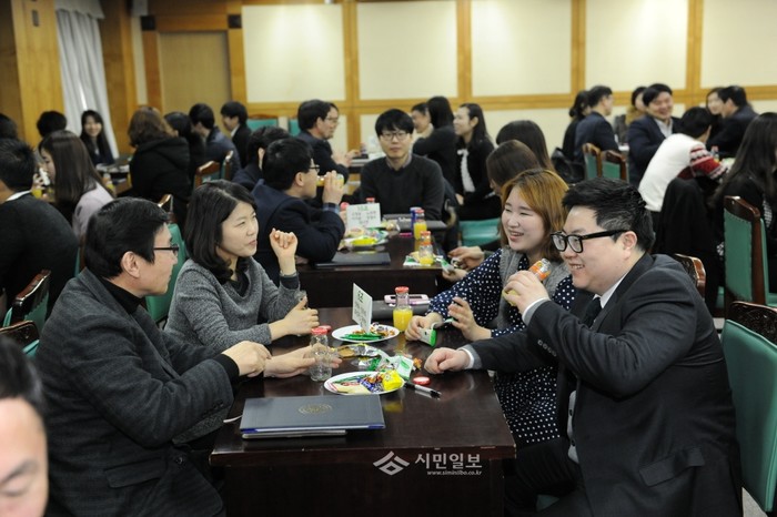 서울 중랑구가 지난 25일 구청에서 '중랑 멘토링 결연식'을 개최했다. 사진은 결연식에서 멘토-멘티로 맺어진 선후배 직원들이 소통의 시간을 갖고 자기소개 후 즐겁게 이야기하며 웃고 있는 모습. (사진제공=중랑구청)