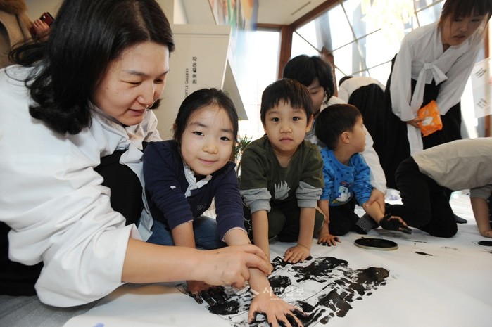 26일 서울 송파구 구청 로비에서 광복 70주년 기념 3.1절을 맞아 실시한 '우리함께 손도장 태극기 만들어요' 행사에 참여한 주민들과 어린이들이 물감을 손바닥에 찍어 태극기를 만들고 있다.(사진제공=송파구청)
