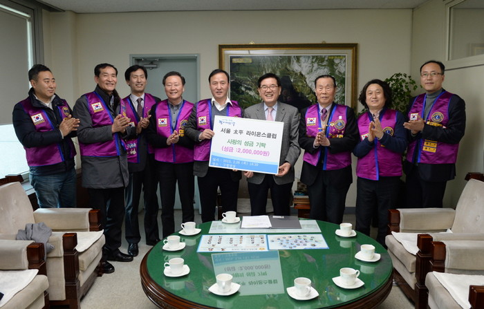태평 라이온스클럽이 최근 서울 동대문구청장실에서 사랑의 성금 200만원을 전달했다. 태평 라이온스클럽이 전달한 성금은 지역내 어려운 이웃과 사회복지 증진을 위해 쓰일 예정이다. 사진은 구청장실을 찾은 태평 라이온스클럽 회원들이 유덕열 동대문구청장(오른쪽 네번째)에게 성금을 전달하고 있는 모습. (사진제공=동대문구청)