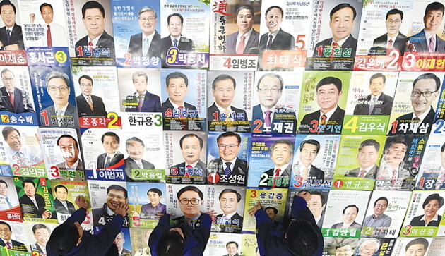 1일 오후 경기 수원 경기도선거관리위원회 직원들이 3.11 전국동시조합장 선거 후보들이 제출한 선거벽보를 확인하고 있다.