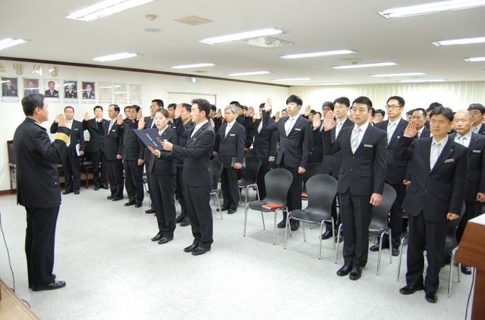 경기 오산소방서는 2일 소방서 3층 회의실에서 소방공무원 80여명이 참석한 가운데 ‘2015년 안전운전 결의대회’를 열었다. 사진은 이날 안전운전 등의 현장활동시 안전사고 방지에 최선을 다할 것을 결의하는 공무원들의 모습. (사진제공=오산소방서)