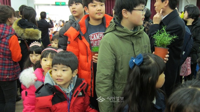 2일 경북 구미시 원호초등학교 강당에서 2015학년도 입학식이 열린 가운데 6학년 학생들이 신입생들에게 전해줄 꽃화분과 함께 1학년 학생들의 손을 잡고 강당으로 입장하고 있다. (사진제공=구미교육지원청)