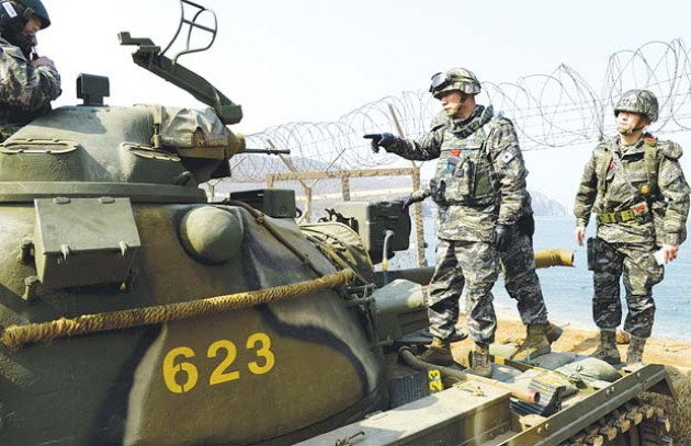 이영주 해병대사령관이 키리졸브(KR)/독수리(FE) 훈련 연습이 시작된 2일 서북도서 최전방 백령도의 해병대 제6여단을 찾아 적 도발에 대비하여 병력과 전투장비의 출동태세와 전투수행절차를 점검하고 있다.
