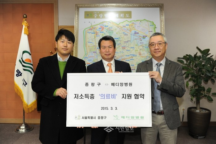 서울 중랑구와 메디앙병원이 3일 '저소득층 의료비 지원 협약'을 체결했다. 사진은 나진구 중랑구청장(가운데)과 위대곤 메디앙병원장이 저소득층 의료비 지원 협약을 체결하고 기념촬영을 하고 있는 모습. (사진제공=중랑구청)