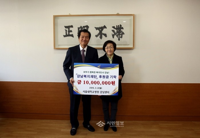 지난 2일 서울대학교병원 강남센터 조상헌 센터장(왼쪽)이, 복지사각지대에 놓여있는 어려운 이웃을 위해 1000만원의 후원금을 강남복지재단에 기부했다. 사진은 조상헌 센터장의 후원금을 전달받은 신연희 구청장(오른쪽)이 기념촬영을 하고 있는 모습. (사진제공=강남구청)