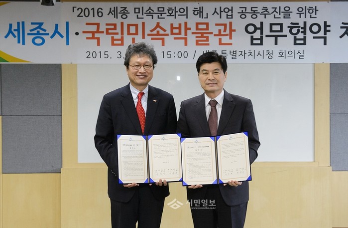 세종시가 국립민속박물관과 손잡고 '2016 세종민속문화의 해' 사업을 함께 추진하기 위해 3일 오후 3시 시청 회의실에서 '2016 세종민속문화의 해' 공동추진을 위한 업무협약을 체결했다. 사진은 이춘희 세종시장(오른쪽)과 천진기 국립민속박물관장이 협약 체결 후 기념촬영을 하는 모습. (사진제공=세종시청)