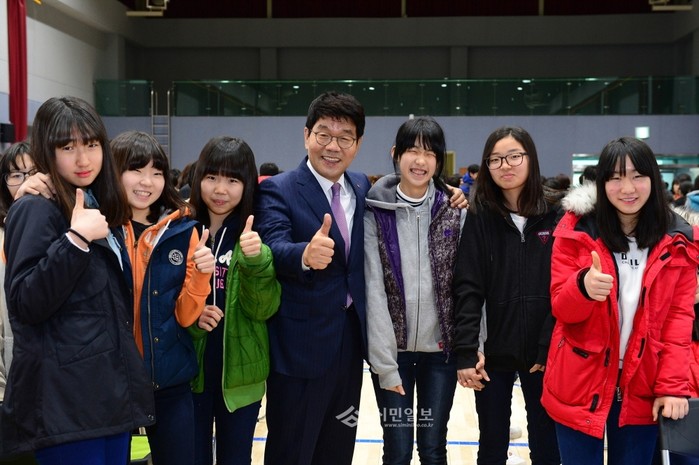 인천 서구에 위치한 인천청람중학교가 지난 3일 오전 10시 입학식을 개최했다. 이날 입학식에는 신입생 243명과 학부모, 교직원, 이청연 교육감 등 400여명이 참석한 가운데 진행됐다. 사진은 입학식에 참석한 인천청람중학교 학생들과 이청연 교육감이 엄지손가락을 들어보이며 기념촬영한 모습. (사진제공=인천시교육청)