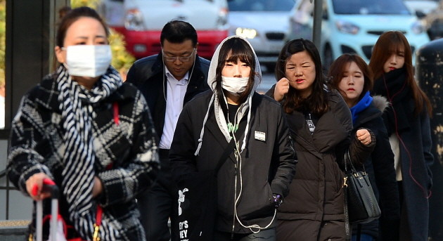 서울 기온이 영하5도까지 떨어지며 꽃샘추위가 기승을 부리는 4일 서울 중구 롯데백화점 본점 인근에서 시민들이 추위를 피해 발걸음을 재촉하고 있다.