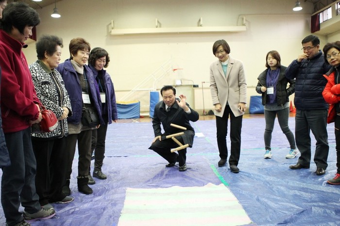 서울 강동구의회 조동탁 의원과 송명화 의원은 최근 ‘2015년 천호2동 정월대보름 민속놀이 큰잔치’에 참석해 주민들과 윷놀이를 하며 을미년의 행운과 안녕을 기원했다. 사진은 윷을 던지고 있는 조 의원과 이를 지켜보고 있는 송 의원의 모습. (사진제공=강동구의회)
