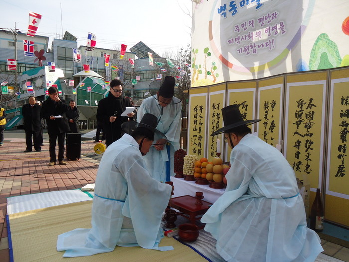 지난 5일 서울 강동구 천호1동에서 정월대보름을 맞아 마을 사람들의 무병과 풍요를 빌고 다함께 모여 마을의 번영을 기원하는 지역 전통행사인 '벽동마을거리제'를 개최했다. 벽동마을은 천호동 일대의 옛 이름이다. 사진은 이날 제례를 올리는 제관들의 모습. (사진제공=강동구청)