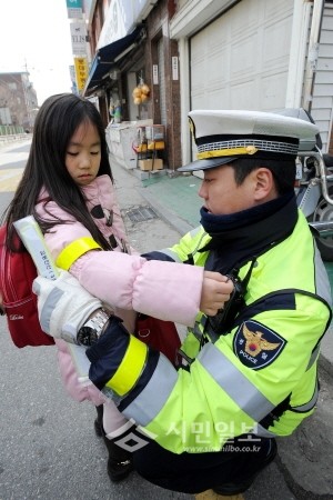 서울 송파구는 지난 5일 오후 석촌초등학교 앞 통학로에서 송파경찰서, 녹색어머니회와 함께 '하굣길 어린이 교통사고 예방을 위한 교통안전 캠페인'을 실시한 가운데 경찰관이 초등학생에게 야광안전띠를 채워주고 있다.
