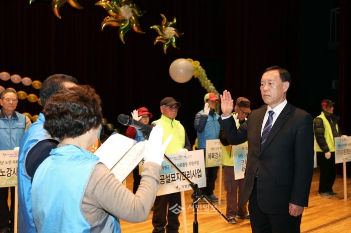 경기 가평군은 9일 가평문화예술회관 대공연장에서 '2015년 사회활동지원사업(노인일자리) 발대식 및 안전교육'을 실시했다. 이날 발대식에는 김성기 가평군수, 주민 등 600여명이 참석해 노인일자리 결의를 다지는 참여자 선언과 축사 등을 진행했다. 사진은 김 군수가 선서를 하고 있는 모습. (사진제공=가평군청)