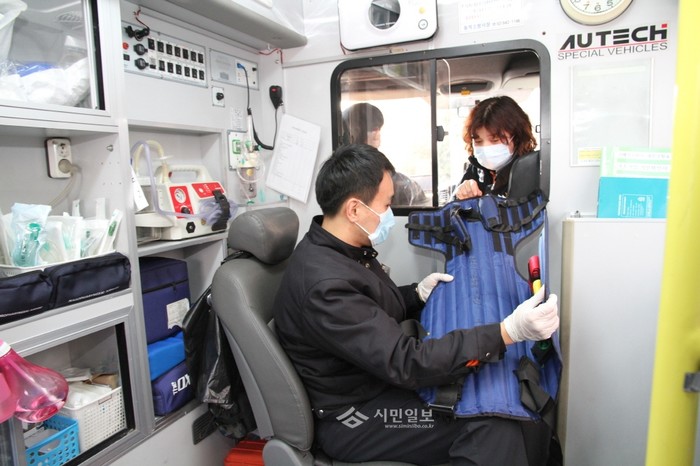9일 서울 동작소방서는 소방학교 신규임용자반 교육생을 대상으로 구급현장활동 및 구급장비 사용법 등 실습교육을 실시했다. 사진은 교육생을 대상으로 구급장비 가운데 허리부상 환자에게 처치할 허리고정 부목 사용법을 알려주는 소방관의 모습. (사진제공=동작소방서)