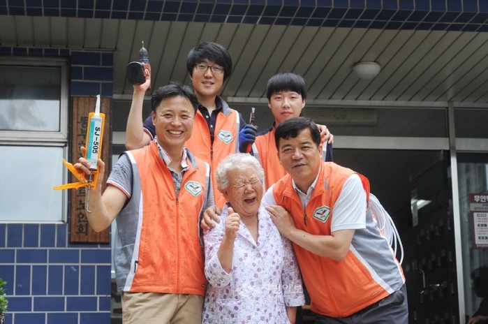 | ▲ 일상생활의 불편사항을 신속히 해결해주는 '1472 살펴드림' 서비스를 받은 한 노인이 관계직원들과 기념촬영을 하고 있다.(사진제공=오산시청) | ||
