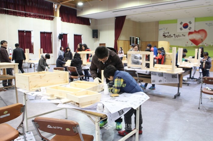 인천 남구청 목공동아리가 최근 지역내 드림스타트 아동들에게 직접 제작한 책상, 책꽂이, 의자 각 10조를 선물했다. 동아리 회원들은 책상, 책꽂이, 의자를 근무 시간 후 10여일에 걸쳐 직접 제작했다. 사진은 목공동아리의 한 회원이 책상을 만들고 있는 모습. (사진제공=남구청)