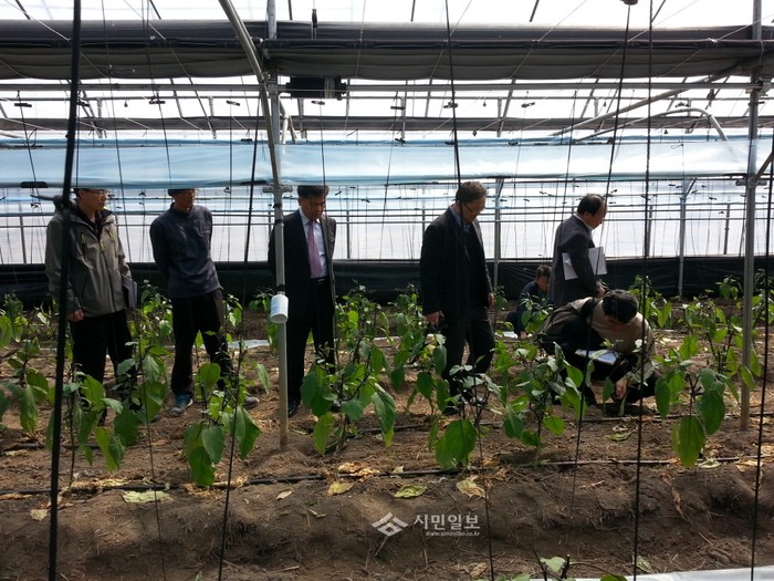 지난 9일 경기 여주시농업기술센터는 농업인의 민원해결을 위해 농촌진흥청과 함께 북내면에 위치한 가지농가에서 가지연구회 회원 등이 참석한 가운데 가지 생육불량 원인 등을 진단하는 현장컨설팅을 실시했다. 사진은 관계자들이 토양을 점검하는 모습. (사진제공=여주시청)