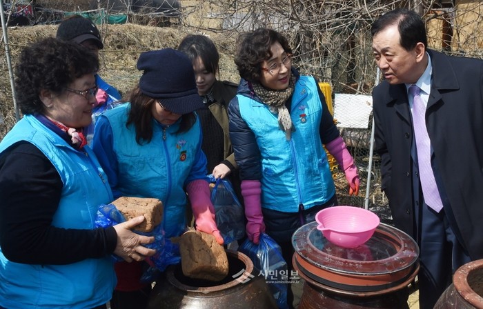 경기 하남시는 지난 9일 두꺼비 농장에서 (사)아이코리아 하남시지회, 다문화가정과 함께 전통 장 담그기 행사를 열었다. 이날 참가자들은 전통간장과 보리고추장을 담갔다. 사진은 이날 행사에 참석한 이교범 시장과 참가자들이 장을 담그고 있는 모습. (사진제공=하남시청)