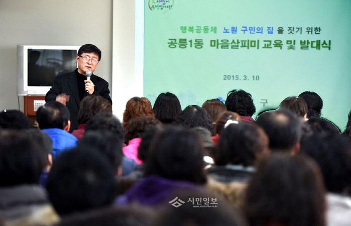 김성환 노원구청장이 지난 10일 오후 서울 공릉1동주민센터에서 열린 '마을살피미 특별교육 및 발대식'에 참석해 지역내 어려운 이웃을 발굴하기 위한 마을살피미의 역할을 설명하고 있다.(사진제공=노원구청)