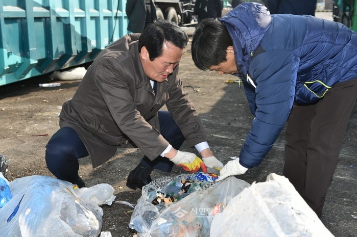 이날 양천클린센터를 방문한 심광식 의장은 청소대행업체 관계자와 아직 미처리돼 적치된 종량제봉투를 직접 개봉해, 분리배출 되지 않고 버려진 재활용 및 음식물쓰레기를 확인하며 쓰레기 처리문제의 심각성을 직접 체험했다.