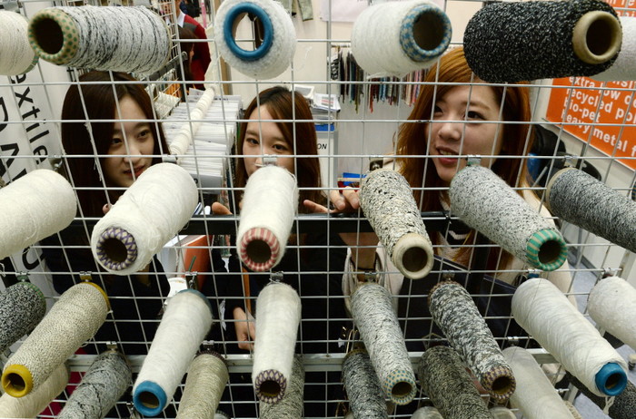 11일 오전 한국 섬유산업의 중심 대구 북구 유통단지로 엑스코에서 열린 '대구국제섬유박람회'를 찾은 경북대학교 의상학과 학생들이 섬유를 살펴보고 있다.