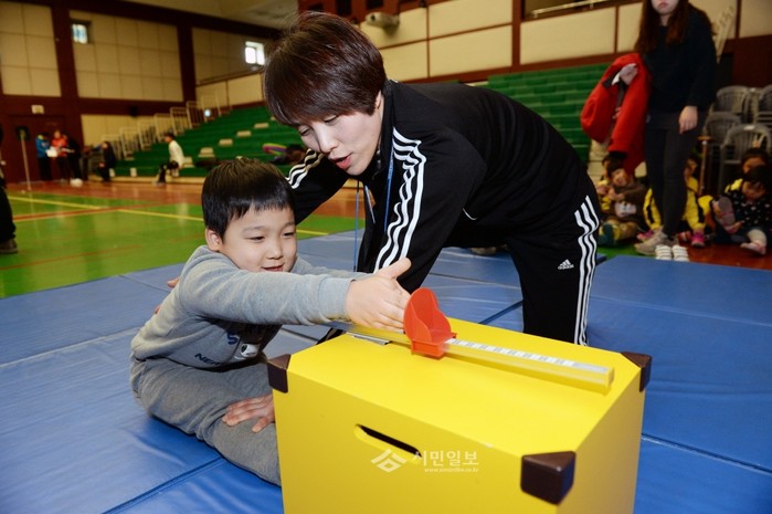 서울 동대문구가 11일 오전 10시 구청 강당에서 어린이 300여명을 대상으로 '큰나무 건강교실'의 사전체력검사를 실시했다. 이날 체력검사에서는 ▲외발서기 ▲5m 왕복달리기 ▲제자리 멀리뛰기 등을 측정했다. 사진은 한 어린이가 유연성 검사를 위해 측정기에 손을 뻗고 있는 모습. (사진제공=동대문구청)