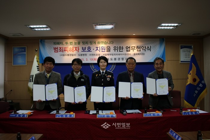 서울 도봉경찰서는 지난 10일 본관 2층 비전홀에서 '범죄피해자 보호·지원을 위한 업무협약식'을 열었다. 협약식에는 보호업무 관련 기관인 도봉병원, 리젠트호텔, 서울북부범죄피해자지원센터, 홍파복지원이 참여해 협력하기로 했다. 사진은 협약식에서 윤성혜 경찰서장(가운데)과 각기관 관계자들이 기념촬영한 모습. (사진제공=도봉경찰서)