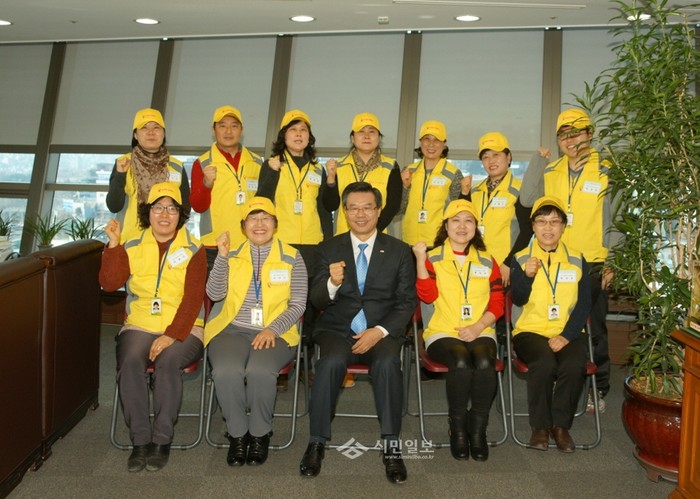 서울 용산구는 최근 구청장실에서 지역내 거주하고 있는 여성·청소년의 귀가를 지원하고 성범죄 취약지역을 중심으로 정기순찰을 실시하고자 ‘여성안심귀가 스카우트’ 11명을 임명했다. 사진은 성장현 용산구청장과 이날 스카우트로 임명된 주민들의 모습. (사진제공=용산구청)