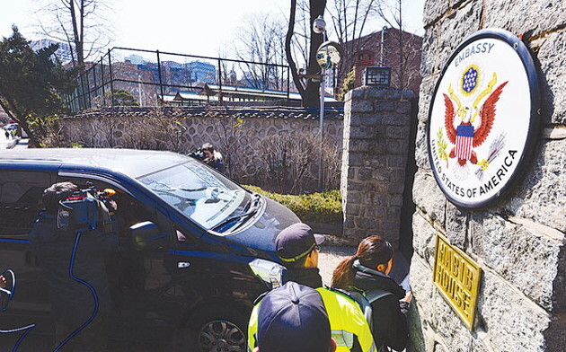 마크 리퍼트 주한미국대사 피습 사건을 수사 중인 경찰이 리퍼트 대사를 상대로 피해자 조사에 나선 12일 오후 경찰 관계자들을 태운 차량이 서울 중구 정동 미국대사관저로 들어서고 있다.