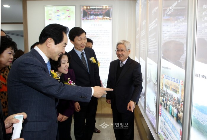 경기 의정부시가 최근 구 파발소방서를 리모델링해 퓨전문화관광 홍보관을 개관했다. 홍보관은 의정부시의 역사와 자연환경, 볼거리 등을 전시하고 있으며 소규모 전시공간으로써 활용이 가능하다. 사진은 안병용 시장(왼쪽)이 개관식에 참석해 홍보관 내 전시관을 관람 중인 모습. (사진제공=의정부시청)