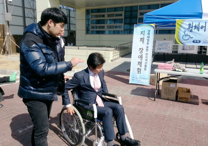 [광명=류만옥 기자]15일 나상성 경기 광명시의회 의장이 지체장애인협회에서 직접 휠체어를 타고 장애인의 어려운 문제점을 체험했다. 나 의장은 장애인의 불편한 인생처럼 참고 견디며 상생의 의정활동을 펼쳐 나가라는 체험을 했다고 장애인들에게 감사의 말을 전했다.