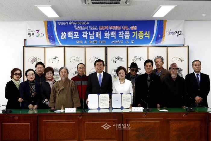 16일 고(故) 곽남배 화백의 유족인 박정자씨(오른쪽에서 여섯번째)가, 전남 진도군에 한국화·문인화·서예·부채·병풍 등 총 75점의 작품을 기증하고, 이동진 군수(왼쪽에서 일곱번째)와 기념촬영을 하고 있다.(사진제공=진도군청)