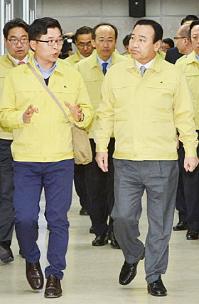 이완구 국무총리가 제397차 민방위의 날 민방공 대피훈련이 실시된 16일 오후 세종시 정부세종청사 위기관리 종합상황실에서 방기성 국민안전처 안전정책실장으로부터 상황보고를 받고 상황실을 나서고 있다.