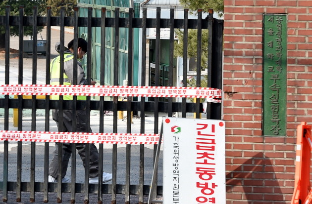 16일 오전 구제역 양성반응이 나온 경기 수원 탑동 서울대학교 실험농장 입구가 출입제한 조치되고 있다. 지난해 12월부터 전국적으로 구제역이 발생한 가운데 수원지역에서 발생은 이번이 처음이다.