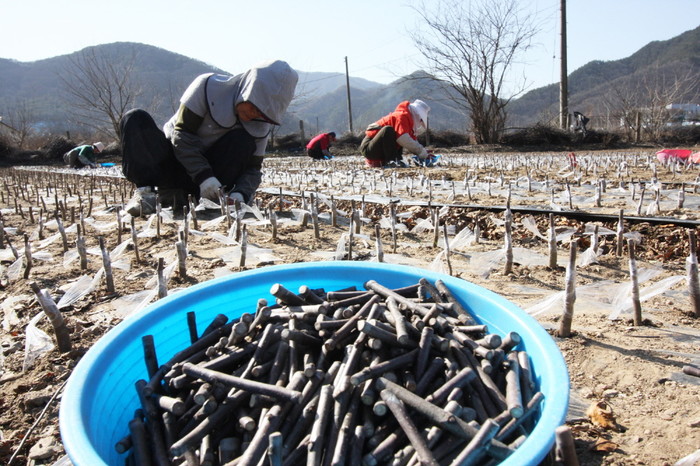 식목 철을 맞이해 16일 '묘목의 고장'인 충북 옥천군 이원면 들녘에서 농민들의 묘목 접붙이기가 한창이다. 이 지역 농민들은 나무에 따라 2월 말부터 오는 5월까지 묘목 접붙이기를 해 1년 뒤 묘목으로 생산해 판매하고 있다. (사진제공=옥천군청)