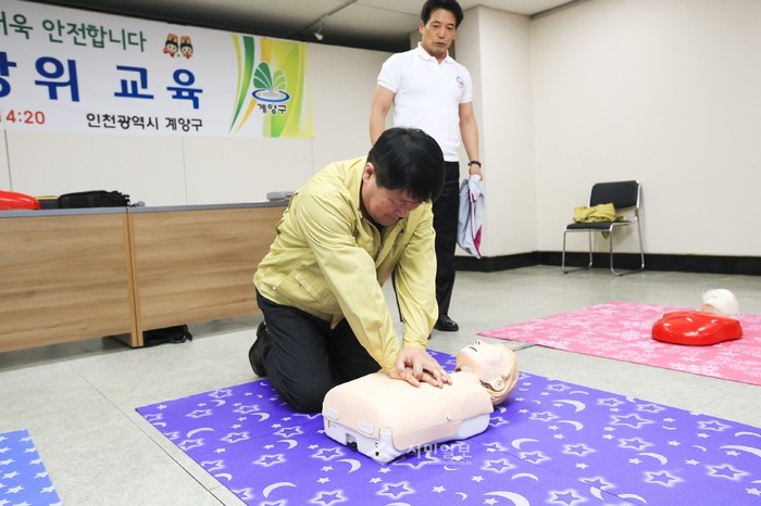 인천 계양구가 지난 16일 오후 2시 구청 지하 대피소에서 제392차 민방위훈련의 일환으로 심폐소생술 교육을 진행했다. 교육에는 박형우 구청장과 전직원이 참여했다. 사진은 박형우 구청장이 심폐소생술을 시연 중인 모습. (사진제공=계양구청)