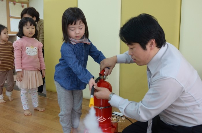 서울 영등포소방서는 17일 오전 여의도동에 위치한 KBS어린이집에서 교사 및 어린이 60여명을 대상으로 실시한 '소방안전교육'에 참가한 한 어린이가 직접 소화기를 만져보며 소화기 사용법을 배우고 있다. (사진제공=영등포소방서)