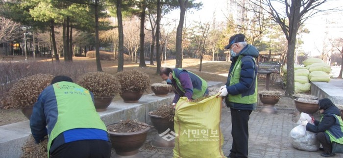 경기 고양시 일산동구 마두2동 주민센터는 지난 14일 새봄맞이 마을 대청소를 실시했다. 이번 행사에는 마두2동 주민자치위원회를 중심으로 주민센터 직원 및 지역내 학생 등 30여명이 참여해 대청소를 진행했다. 사진은 마을 대청소에 참여한 환경지킴이들이 화단을 치우고 있는 모습. (사진제공=고양시청)