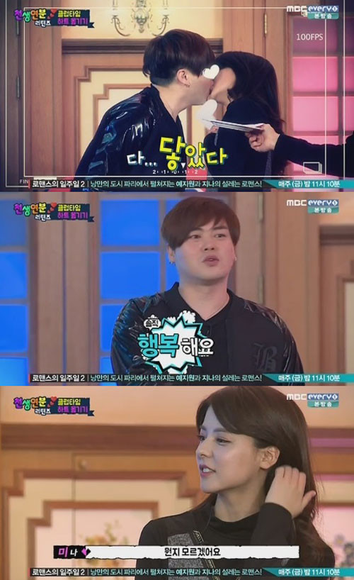 지난 17일 MBC 에브리원 '천생연분 리턴즈'에서 문희준과 후지이 미나가 게임 도중 입이 닿는 사고 아닌 사고가 발생해 눈길을 끌고 있다.