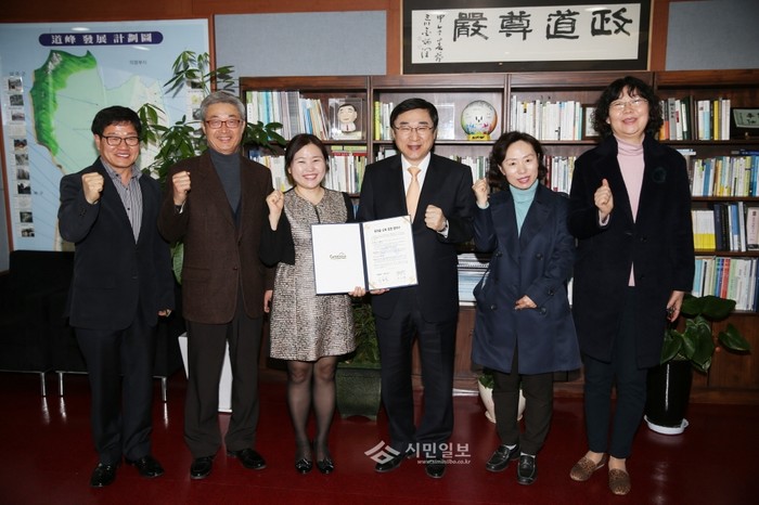 서울 도봉구는 지난 16일 오는 4월부터 진행될 반딧불이유아숲체험장의 원활한 운영을 위해 (사)에코아이 생태교육연구소와 운영 프로그램 공유 및 자원봉사활동 협약을 체결했다. 사진은 협약식이 끝난 후 이동진 구청장(오른쪽에서 세번째) 및 관계자들이 기념촬영을 하고 있는 모습. (사진제공=도봉구청)