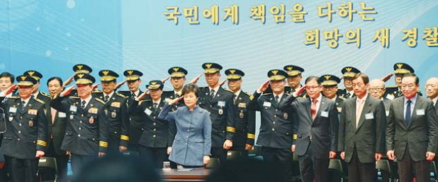18일 오후 경기도 용인시 경찰대학교에서 열린 2015년 경찰대학생 간부후보생 합동임용식에 참석한 박근혜 대통령이 총학생장의 거수경례에 거수경례로 답하고 있다.