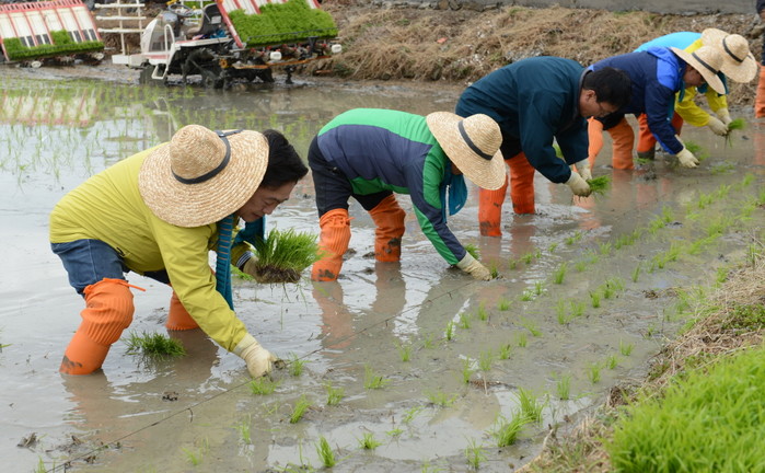 19일 전남 순천시 해룡면 신성마을 백인기씨(48)의 논 0.3㏊에서 전국 첫 노지 모내기 행사가 열리고 있다. (사진제공=순천시청)